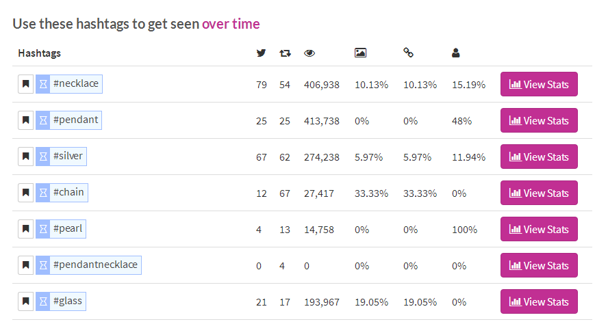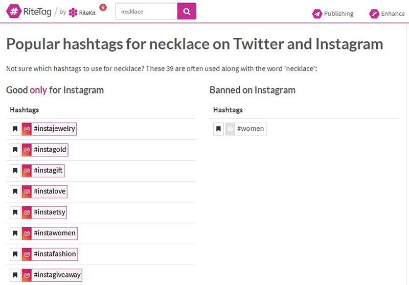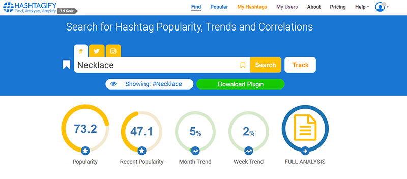 Hashtagify可以让你寻找到符合你要求的标签。你只需要在Hashtagify里的搜索栏中输入你的标签关键词,Hashtagify就会为你生成符合这个关键词的标签,以 necklace为例。如图所示: