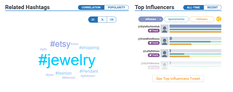 输入完毕以后,你会在“Related Hashtags”中看见它为你生成的相关的标签。同时你可以点击其中的“Top Influencers”,在这里你可以看见各个标签的流行度排行榜,这会更有利于你分析并选择合适的标签。如图所示: